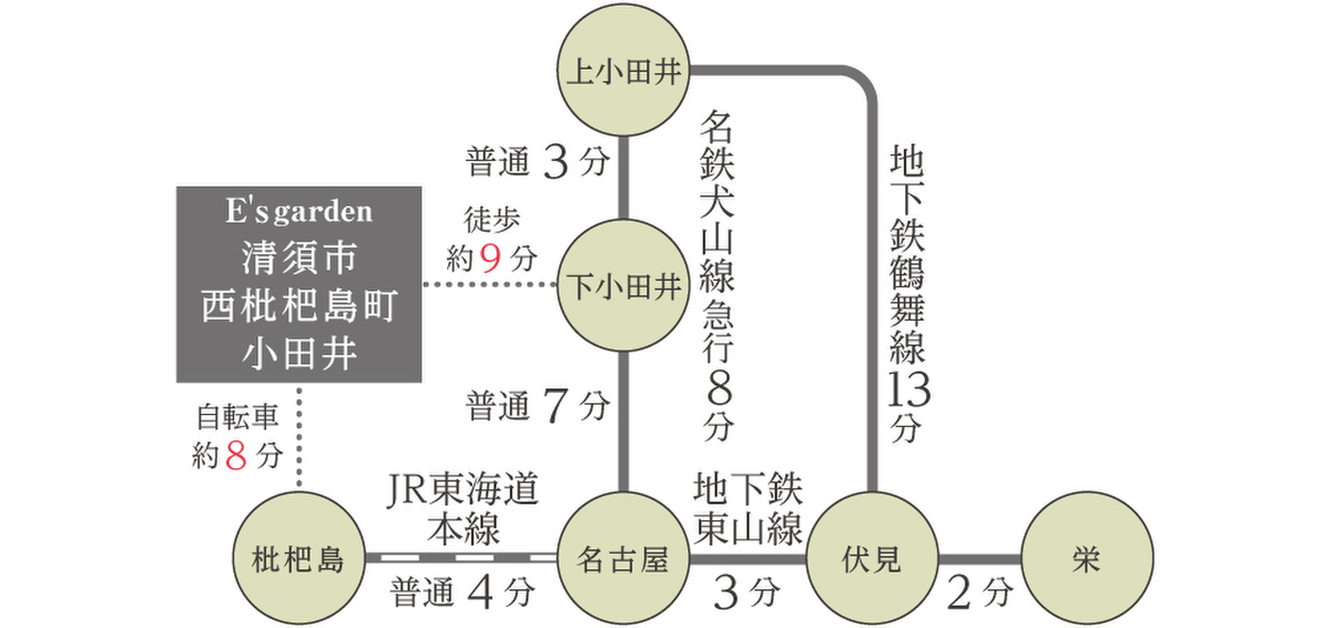 名鉄犬山線「下小田井」駅 徒歩9分 自転車約3分 JR東海道本線「枇杷島」駅 徒歩24分 自転車約8分 JR東海交通城北線「枇杷島」駅 徒歩24分 自転車約8分 |