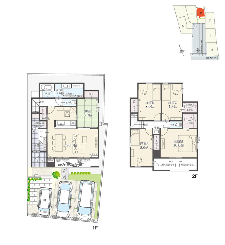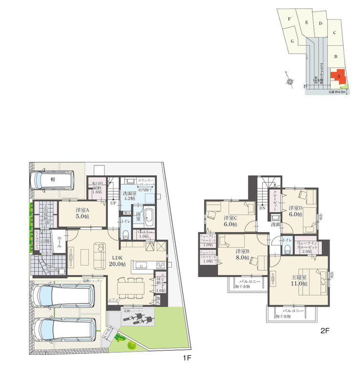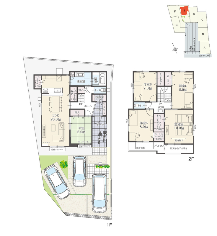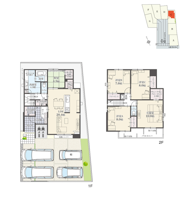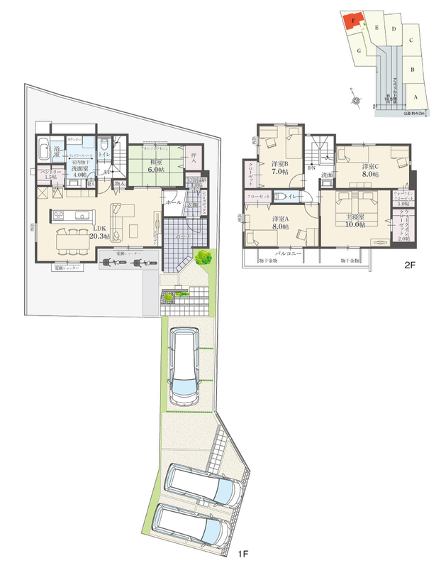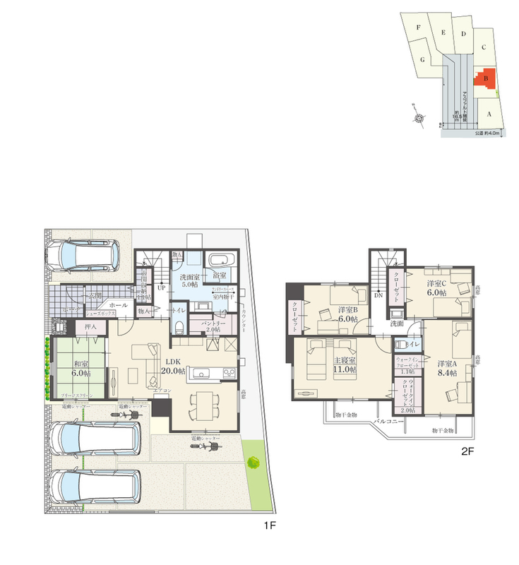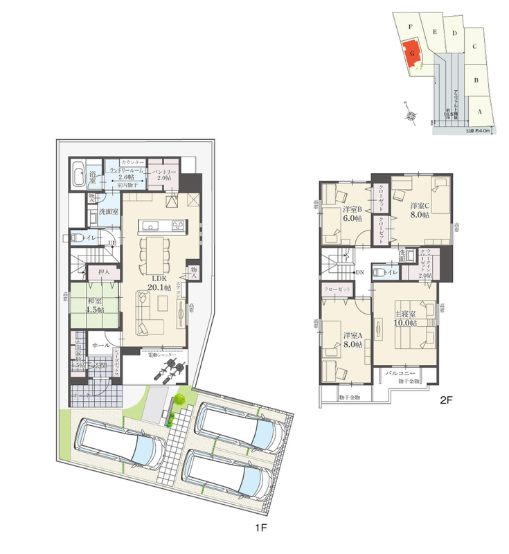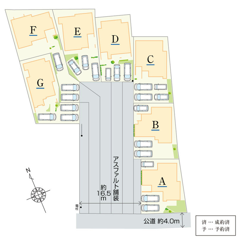 | 駐車場 | 3台 ~ 4台(A・B・D・E・F・G棟(3台)・C棟(4台)) | 道路の幅員 | 南側約4.0m公道、私道負担有(詳細は備考) |