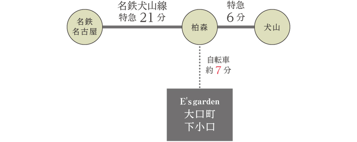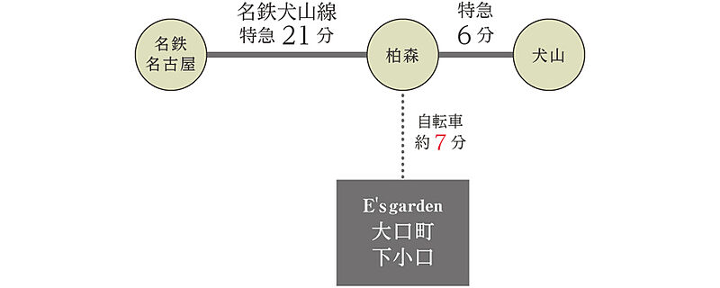 名鉄犬山線「柏森」駅 徒歩22分 自転車約7分 コミュニティバス「下小口学共前」停 徒歩3分 コミュニティバス「山田外科内科前」停 徒歩5分 |