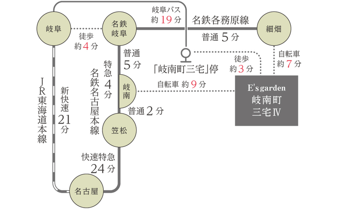 名鉄各務原線「切通」駅 徒歩16分 自転車約6分 名鉄各務原線「細畑」駅 徒歩20分 自転車約7分 名鉄名古屋本線「岐南」駅 徒歩27分 自転車約9分 |