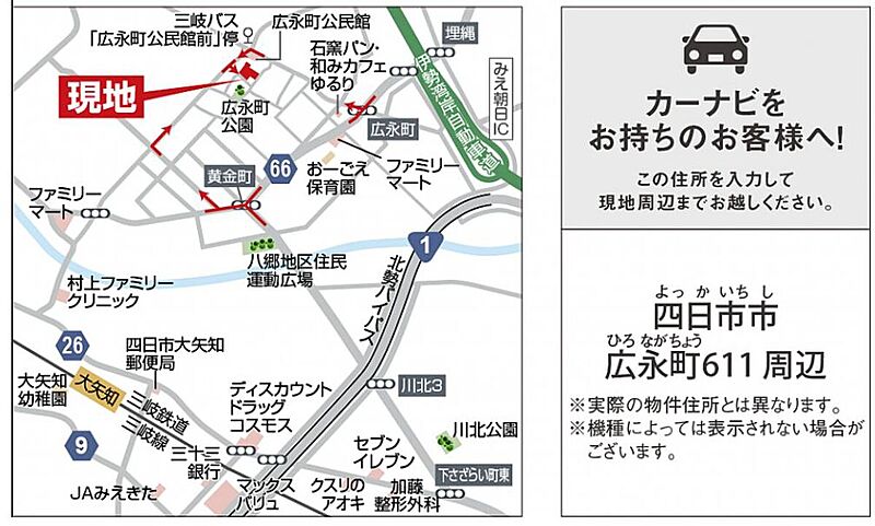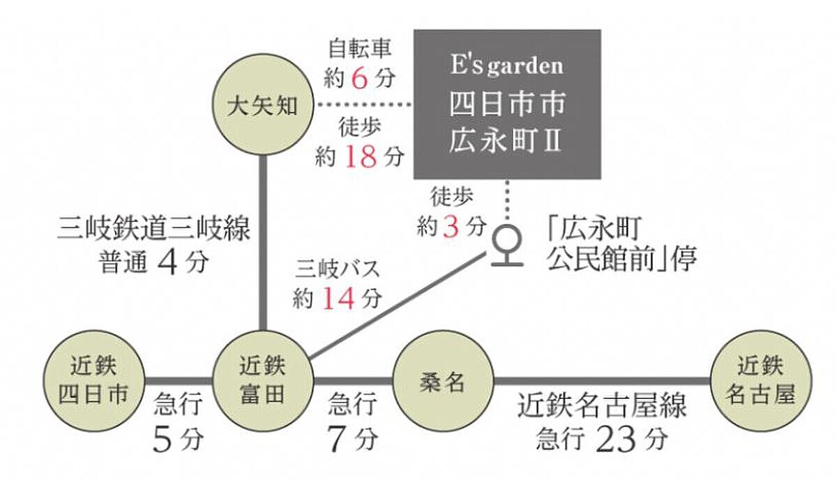 三岐鉄道三岐線「大矢知」駅 徒歩18分 自転車約6分 三岐バス「広永町公民館前」停 徒歩3分 |