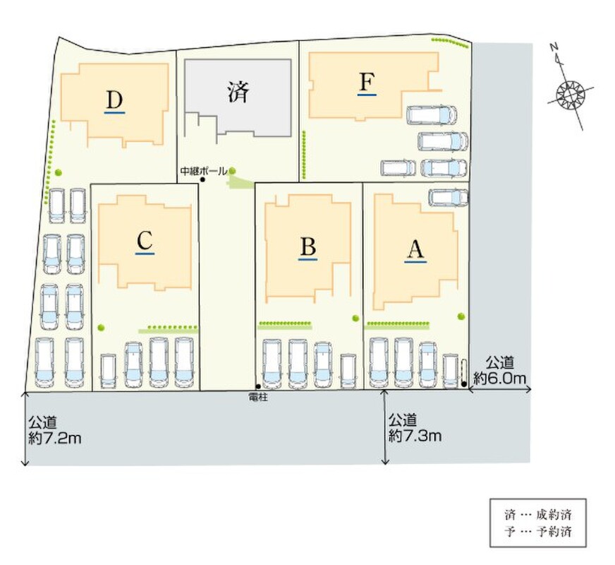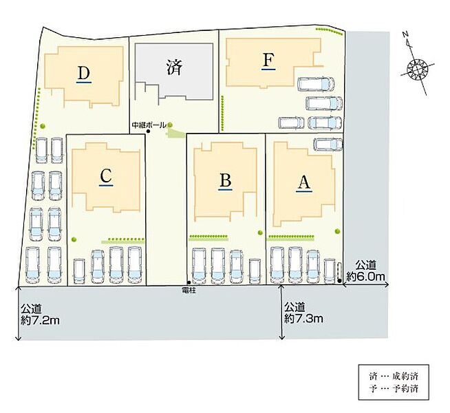 | 駐車場 | 4台 ~ 8台(A棟(5台)、B・C・F棟(4台)、D棟(8台)) | 道路の幅員 | 公道:東側約6m~南側約7.3m |