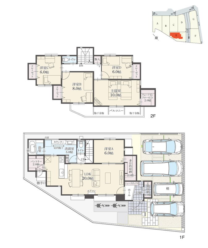 ・私道負担:D棟2.62m2、E棟82.14m2、F棟84.69m2、G棟1.46m2(各々土地面積に含む) ・通行地役権:D棟の土地面積のうち2.62m2はE・F・G棟の通行地役権、E棟の土地面積のうち82.14m2はD・F・G棟の通行地役権、F棟の土地面積のうち84.69m2はD・E・G棟の通行地役権、G棟の土地面積のうち1.46m2はD・E・F棟の通行地役権が各々設定されます。 ・その他制限事項:日影制限有 ・諸経費が別途必要となります。詳細については係員までお問合せ下さい。 ・掲載の間取り図・区画図は計画段階のものを基に描き起こしたもので、実際とは異なる場合がございます。 ・所要時間は地図上の概測距離を80m=徒歩1分、250m=自転車1分で計算したものです。 ・駐車台数は、区画図または各間取り図に表示の自動車サイズを想定しております。車種によっては駐車台数が異なる場合があります。 ・内観写真内の家具はモデル用又はCG加工によるものであり、実際の物件には付属していません。 |
