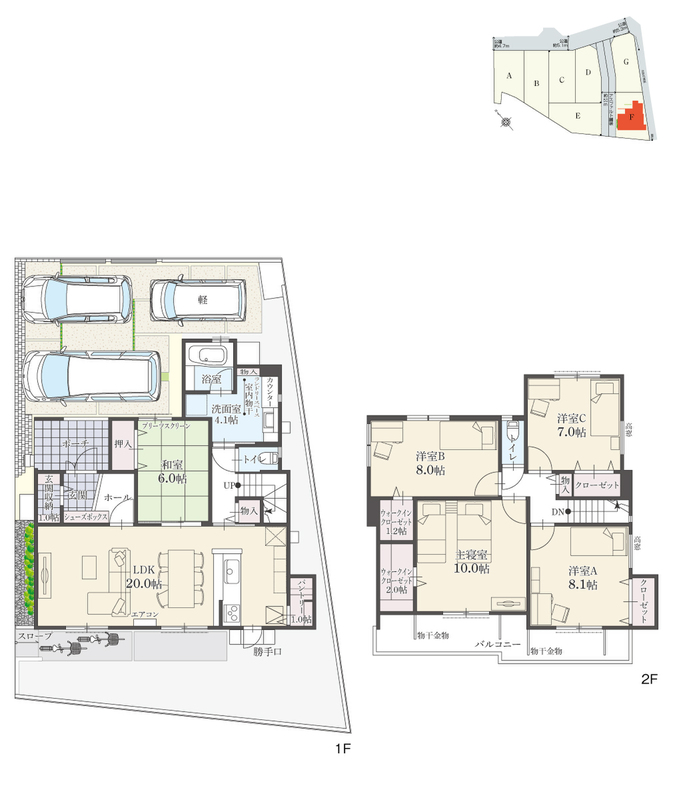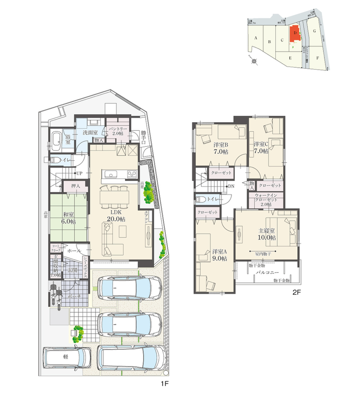 | 間取り | 5LDK | 建物構造 | D・G棟:木造瓦及びガルバリウム鋼板葺2階建、E・F棟:木造瓦葺2階建 |