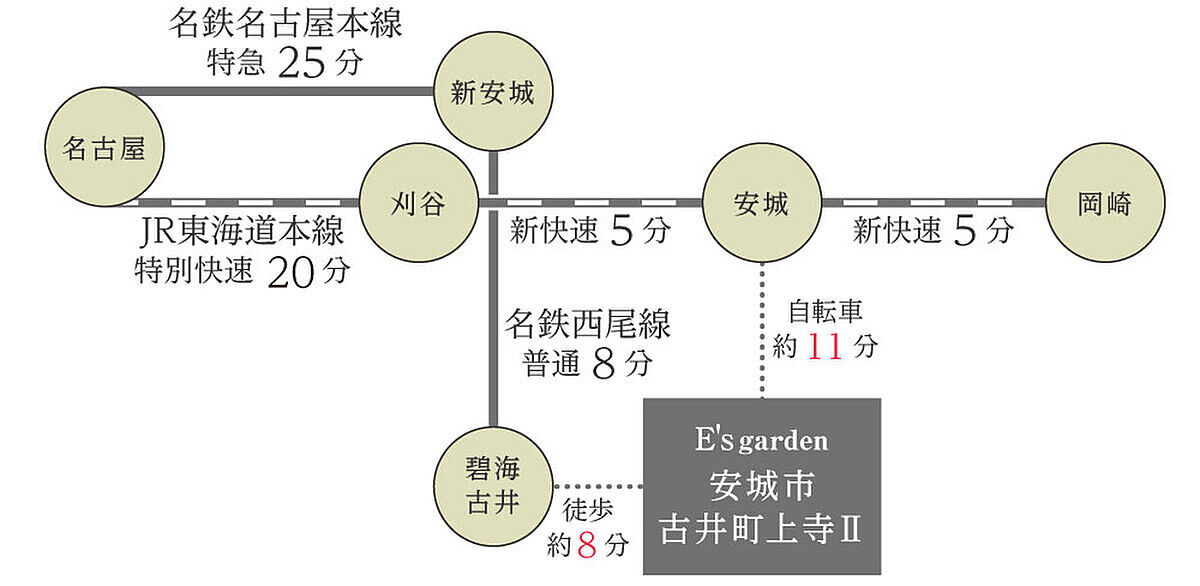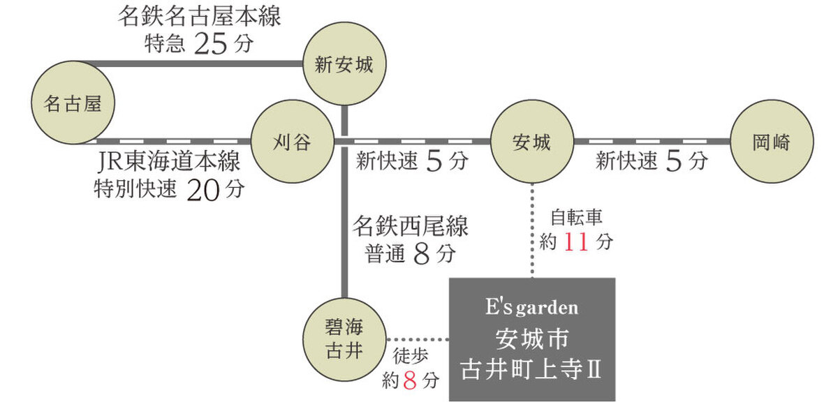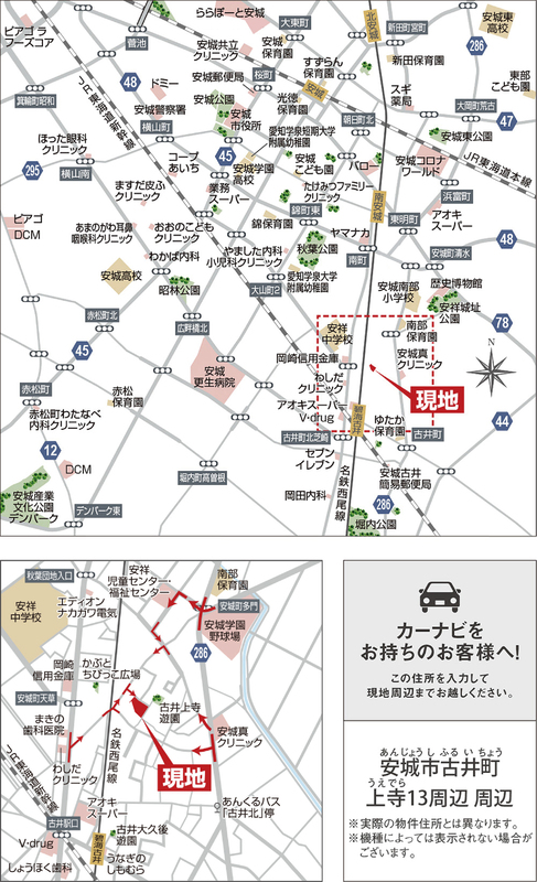 名鉄西尾線「碧海古井」駅 徒歩8分 自転車約3分 JR東海道本線「安城」駅 徒歩32分 自転車約11分 あんくるバス「古井北」停 徒歩7分 |
