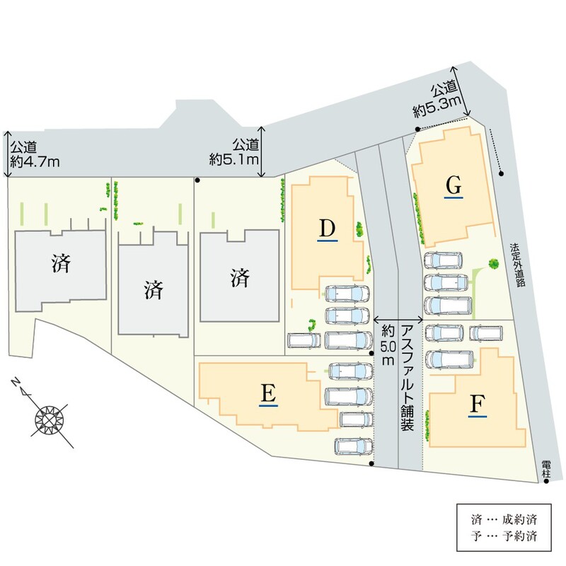 | 駐車場 | 3台 ~ 4台(D・E棟(4台)、F・G棟(3台)) | 道路の幅員 | 約5.1~5.3m公道、私道負担有(詳細は備考) |