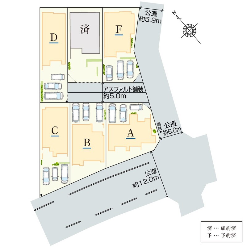 | 駐車場 | 3台(※車種による) | 道路の幅員 | 南西側約12.0m公道、南東側約5.9m~約6.0m公道、私道負担有(詳細は備考) |
