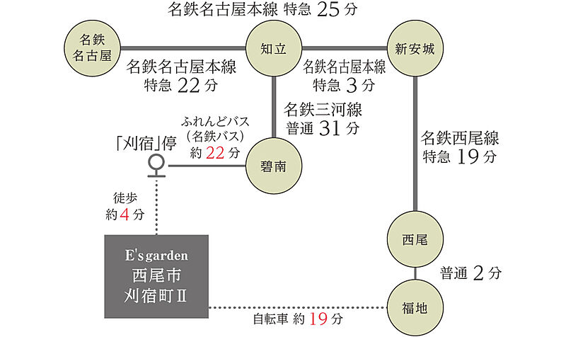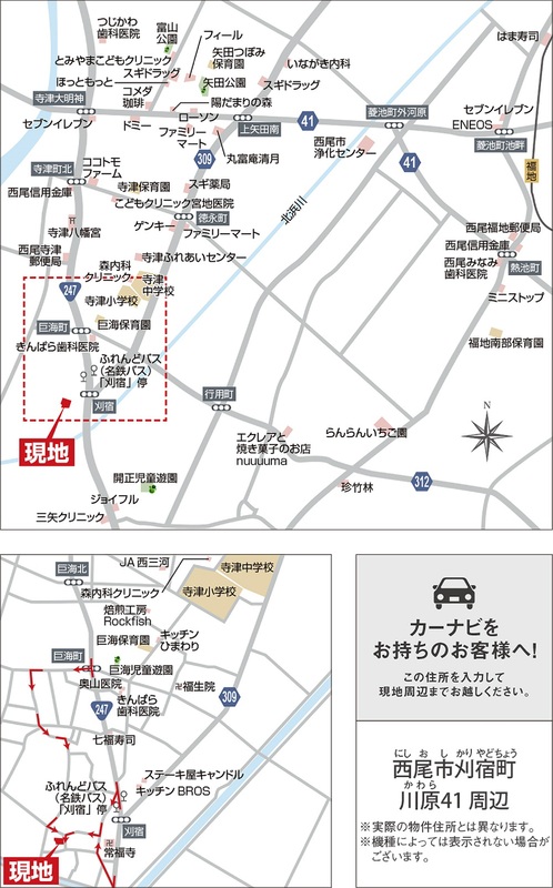 名鉄西尾線「福地」駅 徒歩58分 自転車約19分 ふれんどバス(名鉄バス)「「刈宿」」停 徒歩4分 自転車約2分 |