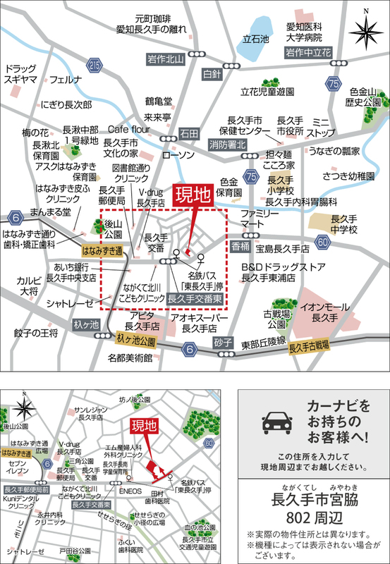 愛知高速東部丘陵線「はなみずき通」駅 徒歩9分 自転車約3分 名古屋市営東山線「藤が丘」駅 徒歩28分 自転車約9分 名鉄バス「東長久手」バス停 徒歩2分 |