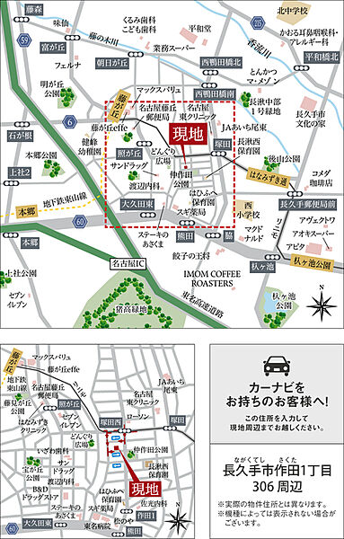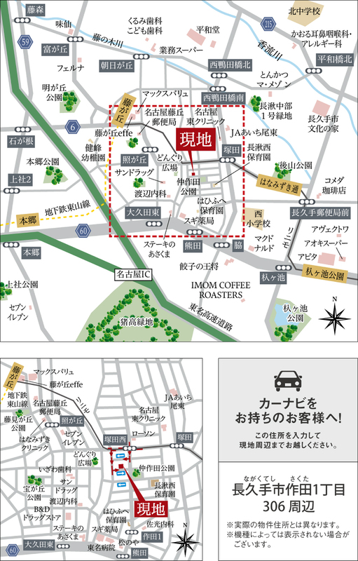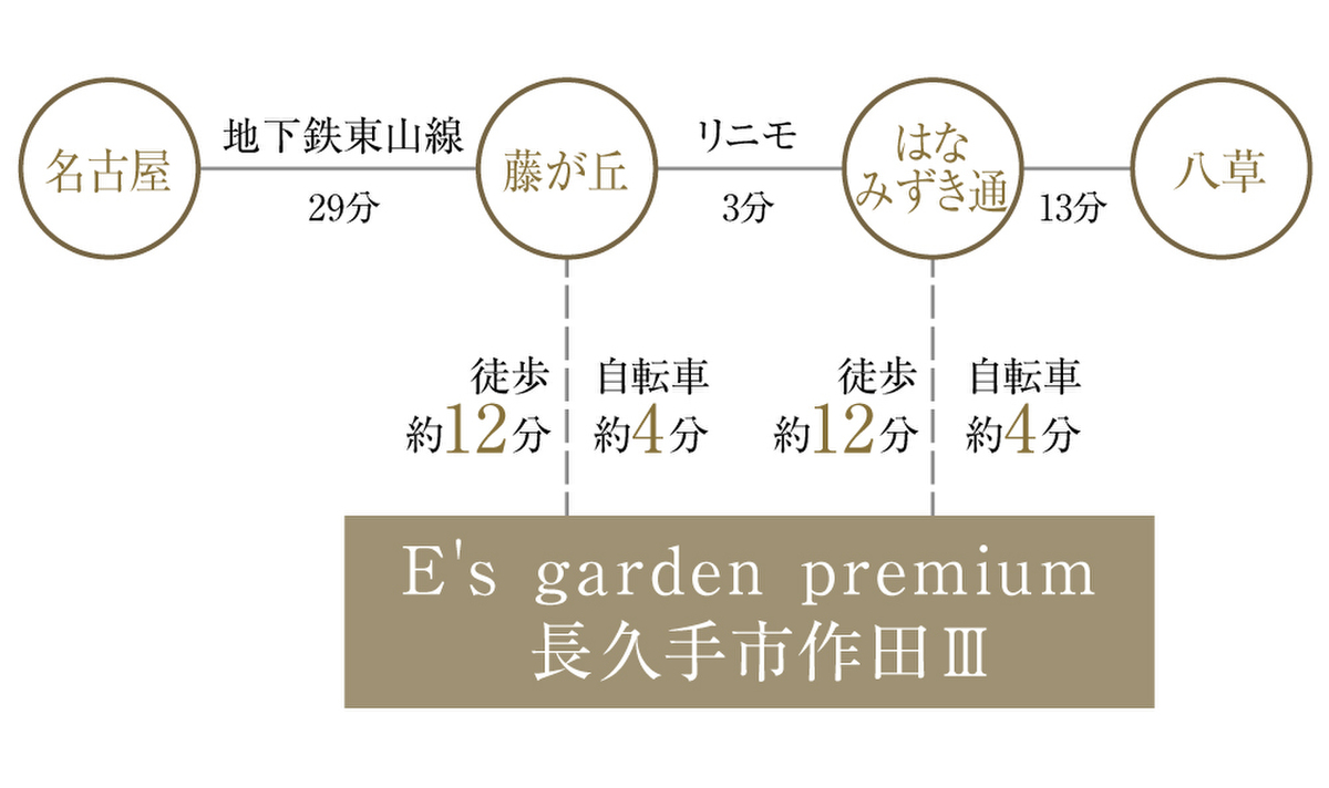 名古屋市営東山線「藤が丘」駅 徒歩12分 自転車約4分 愛知高速東部丘陵線「藤が丘」駅 徒歩12分 自転車約4分 愛知高速東部丘陵線「はなみずき通」駅 徒歩12分 自転車約4分 |