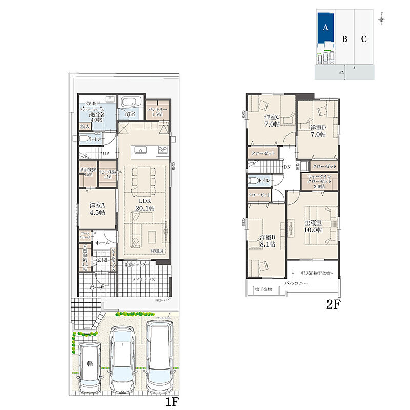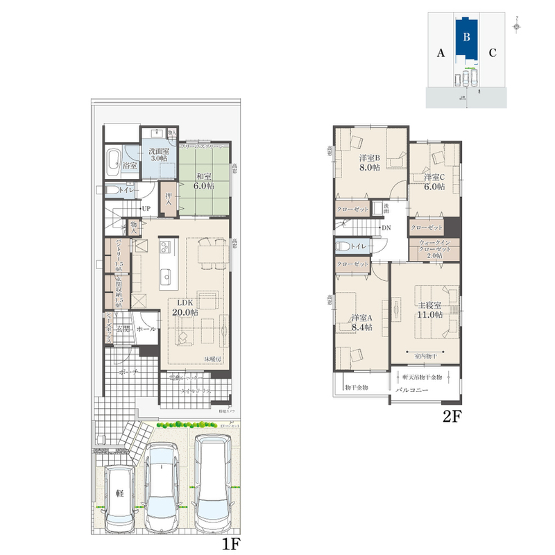 | 建物面積 | 140.66m2(42.54坪)~144.28m2(43.64坪) | 土地面積 | 158.71m2(48.00坪)~158.72m2(48.01坪) |