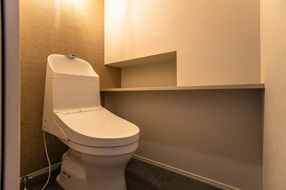 トイレには小物やトイレットペーパーをすっきりと置ける便利なカウ...