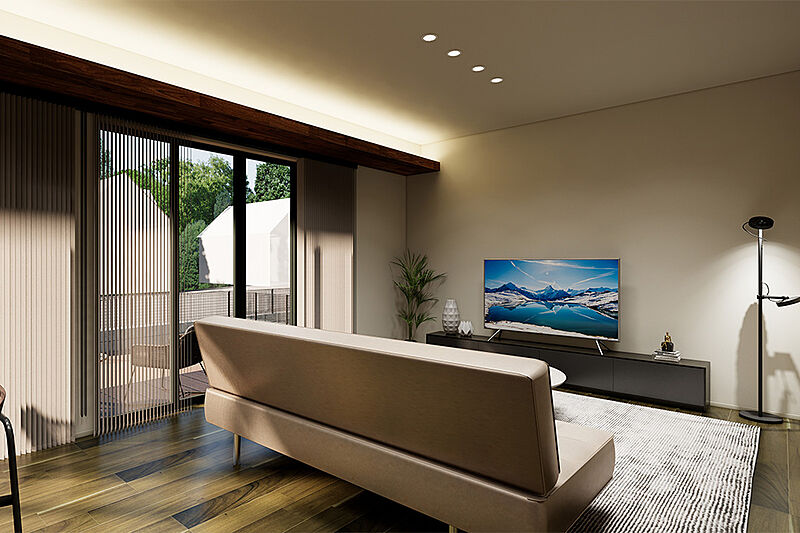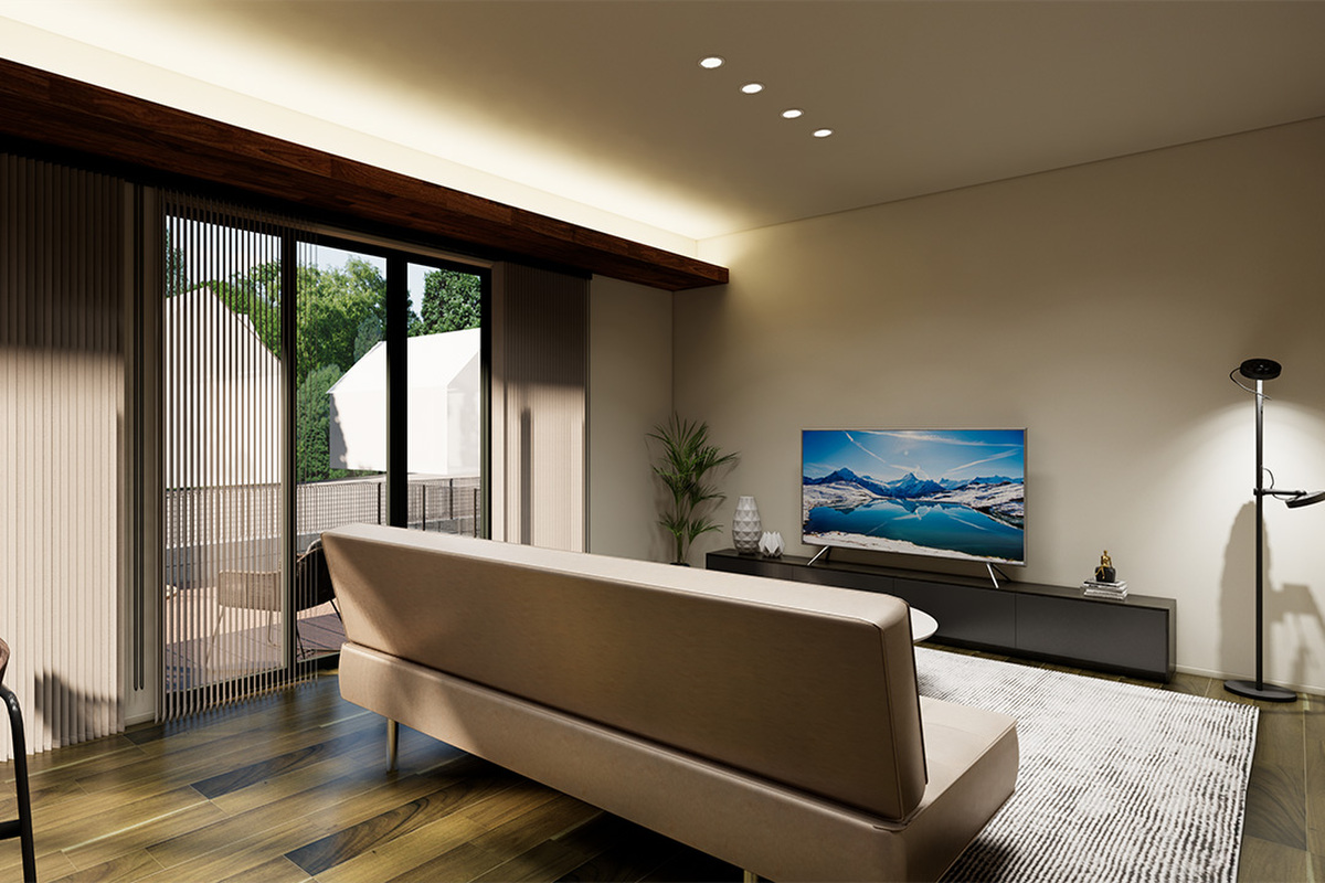 折下げ天井と天井際のコーブ照明が、奥行きと広がりを感じさせる心...