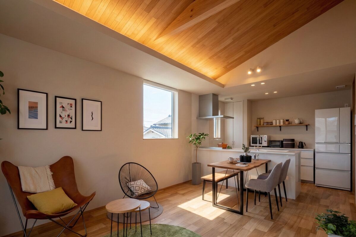(1)広々20帖のLDKにお洒落な勾配天井 (2)明るい内装と2階LDKならではの景観 (3)プライベートなスカイバルコニー