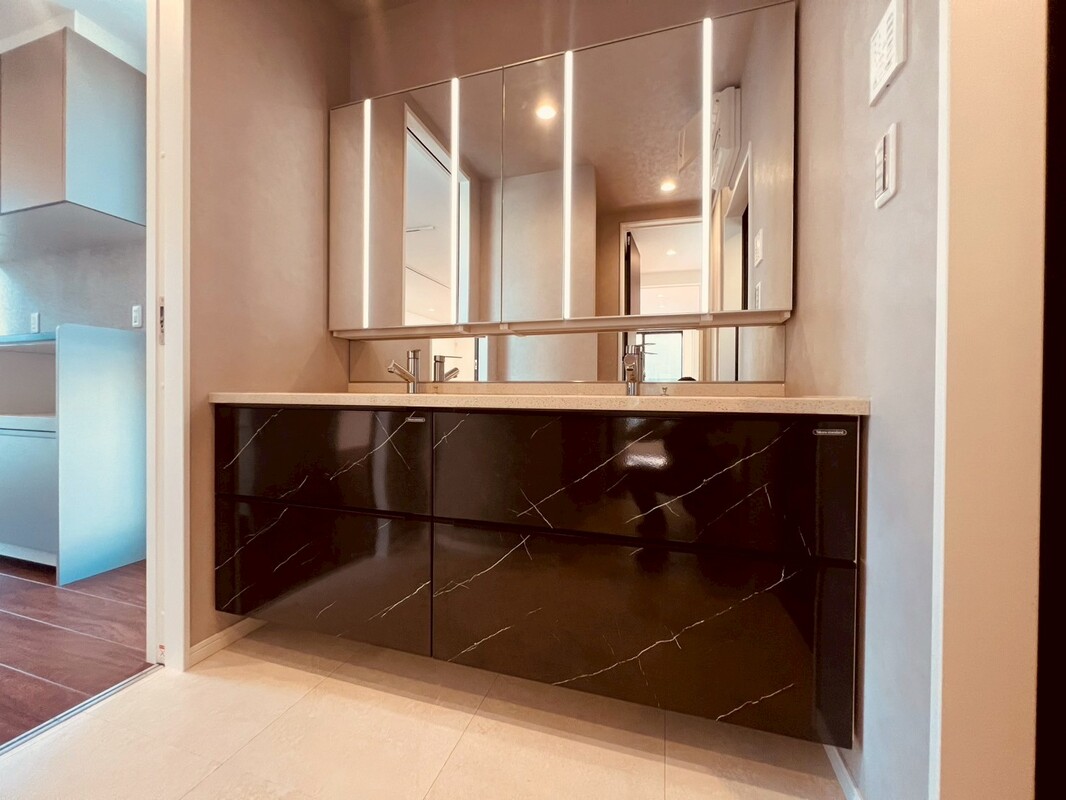 ゆとりある2ボウル仕様で、ご家族が並んで使えて忙しい朝も快適。収納も充実し、すっきりとした空間を保てます。