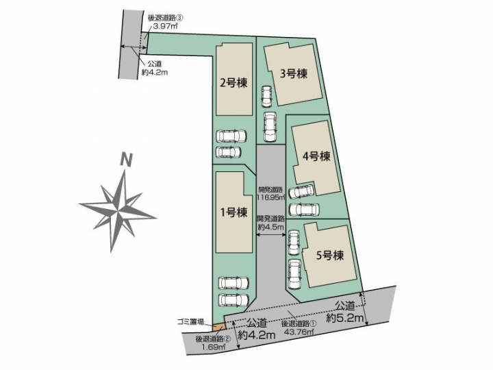 【接道】南4.2m公道、西4.2m公道、東4.5m開発道路 【設備】公営水道、東京電力、都市ガス、本下水 【セットバック】要 【その他持分】【ゴミ置場】1.69m<sup>2</sup>×各1/5 |