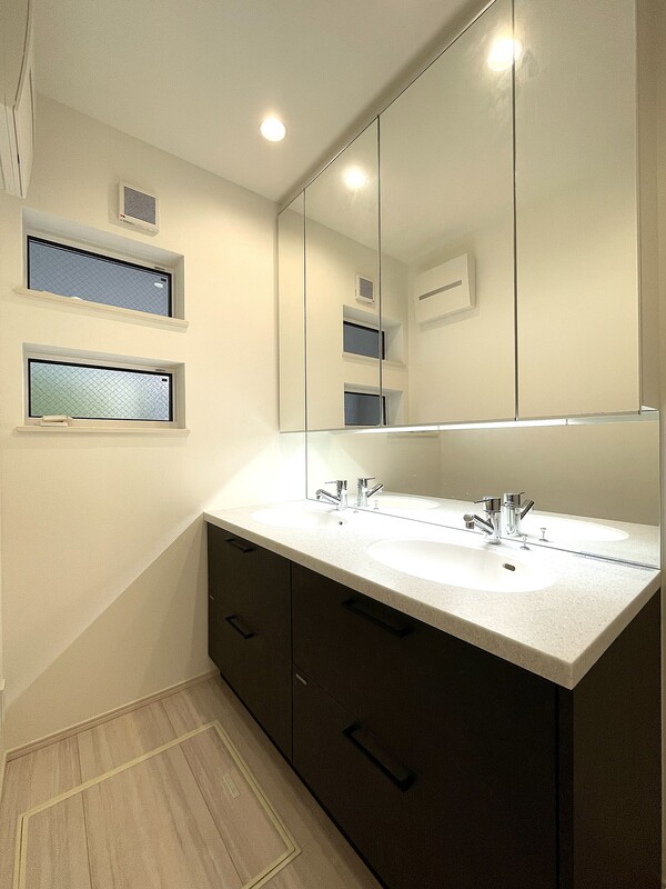 ■朝の身支度もスムーズな2ボウル4面鏡洗面化粧台採用