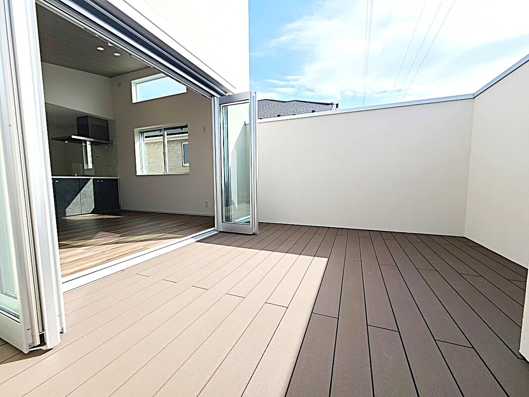 ■リビング繋がりのウッドデッキは 暖かな陽射しが降り注ぐ 寛ぎのスペース