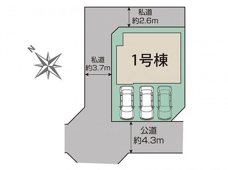 | 駐車場 | 2台 | 道路の幅員 | 南西約4.3m公道、北東約2.6m私道、北西約3.7m私道 |