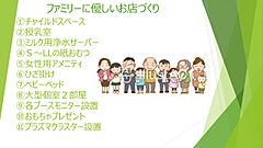 1.店舗敷地内に大型駐車場完備、マイカーでも安心! 2.チャイルドスペース、授乳室、ベビーベッド完備 3.他にもファミリーに優しい、『あったら良いな』がここにある! ミルク用浄水サーバー、紙おむつ、アメニティ、大型個室2部屋、各ブースモニター、プラズマクラスター