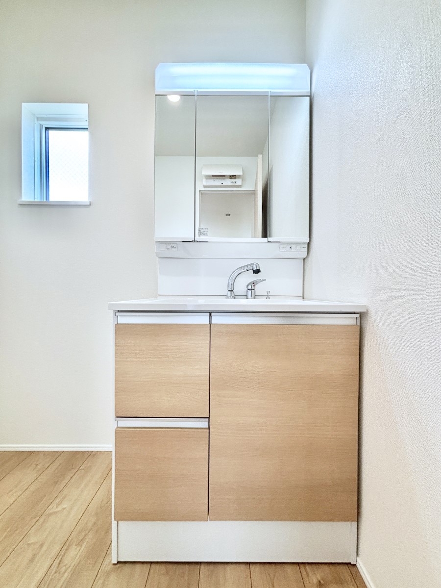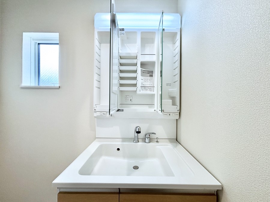 三面鏡の裏に、化粧品や衛生用品などを収納...