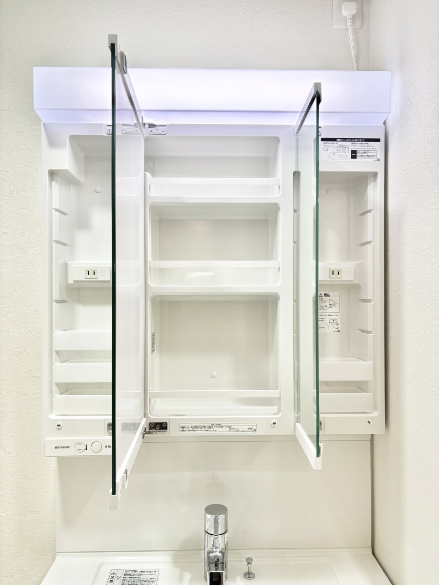 三面鏡の裏に、化粧品や衛生用品などを収納...