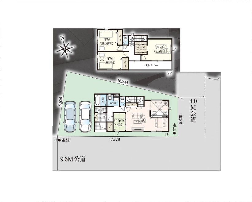| 駐車場 | 2台 | 道路の幅員 | 南9.6m 公道 東4m 公道 |