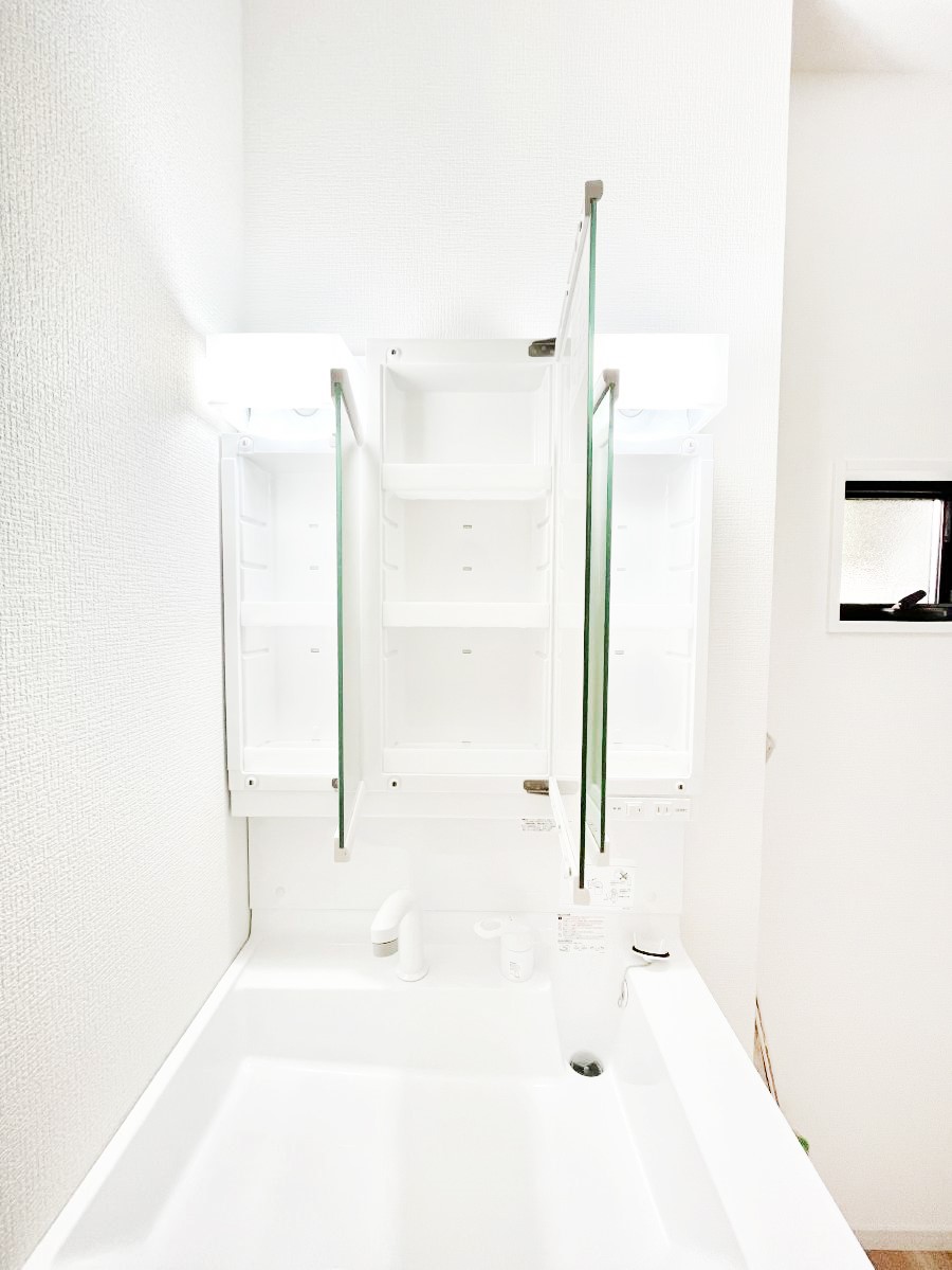 三面鏡の裏に、化粧品や衛生用品などを収納...