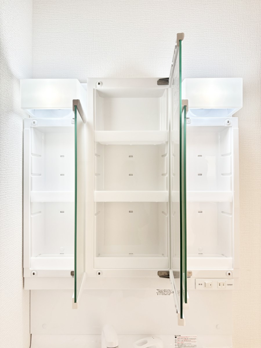 三面鏡の裏に、化粧品や衛生用品などを収納...