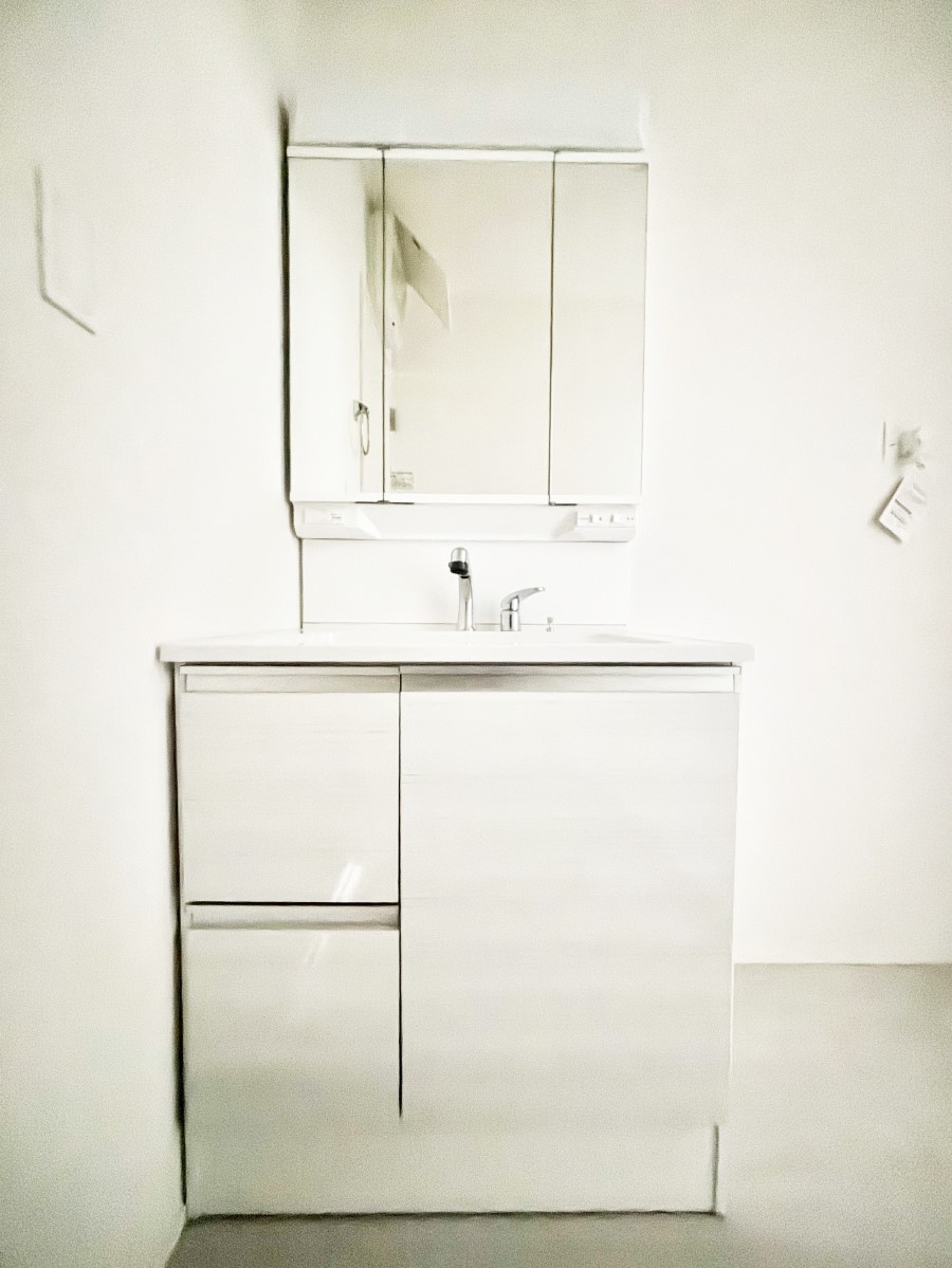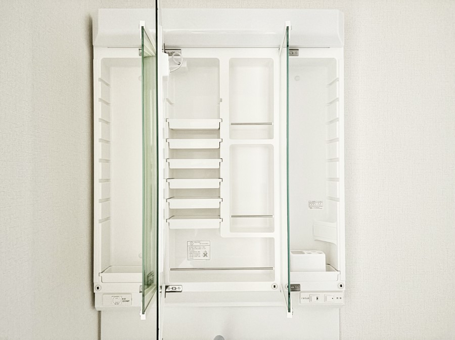 三面鏡の裏に、化粧品や衛生用品などを収納...