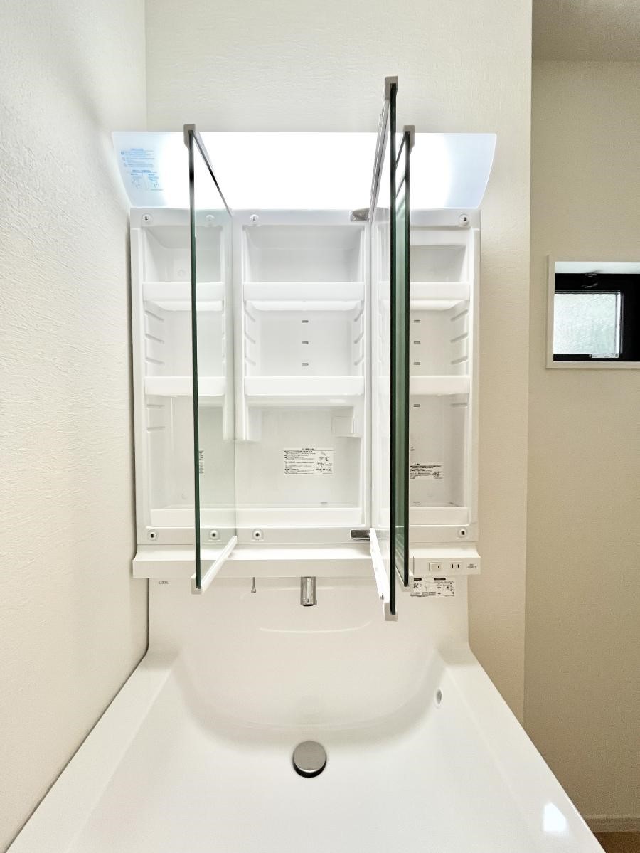 三面鏡の裏に、化粧品や衛生用品などを収納...