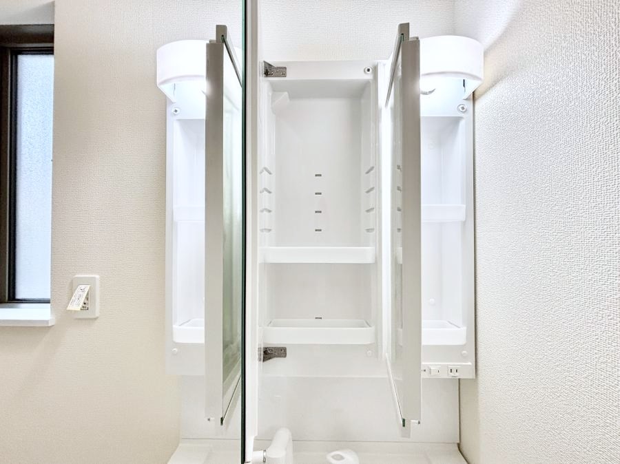 三面鏡の裏に、化粧品や衛生用品などを収納...
