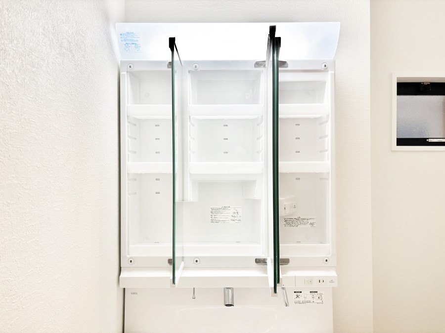 三面鏡の裏に、化粧品や衛生用品などを収納...