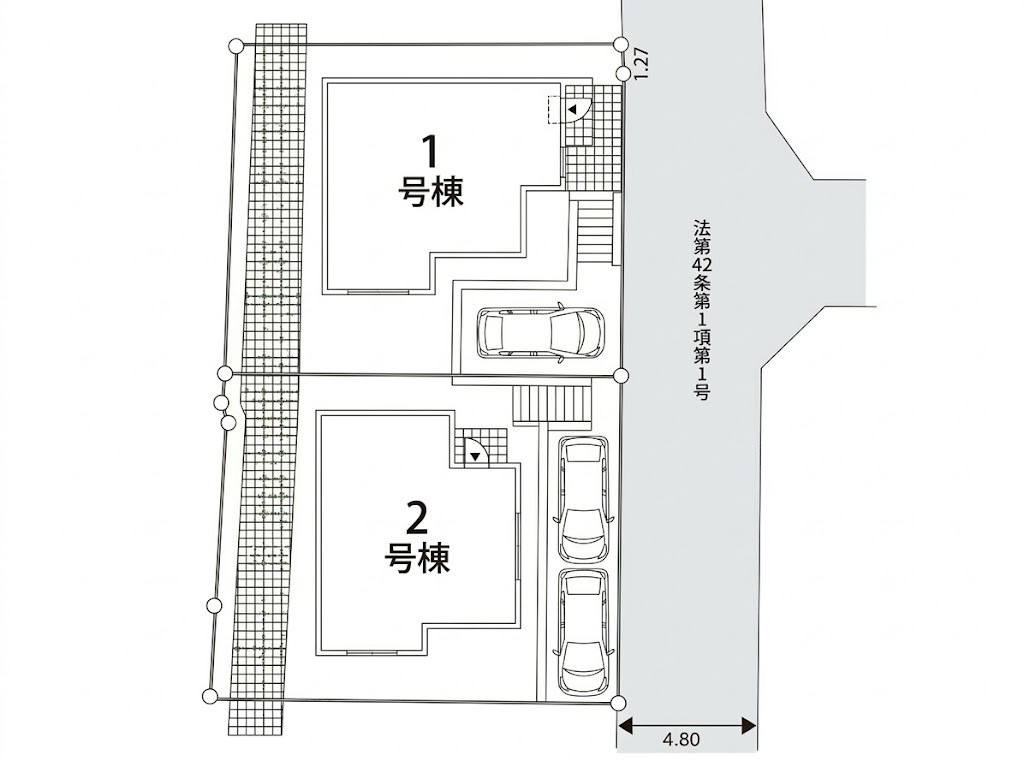 | 駐車場 | 1台 ~ 2台 | 道路の幅員 | 1号棟:東4.8m/2号棟:東4.8m |