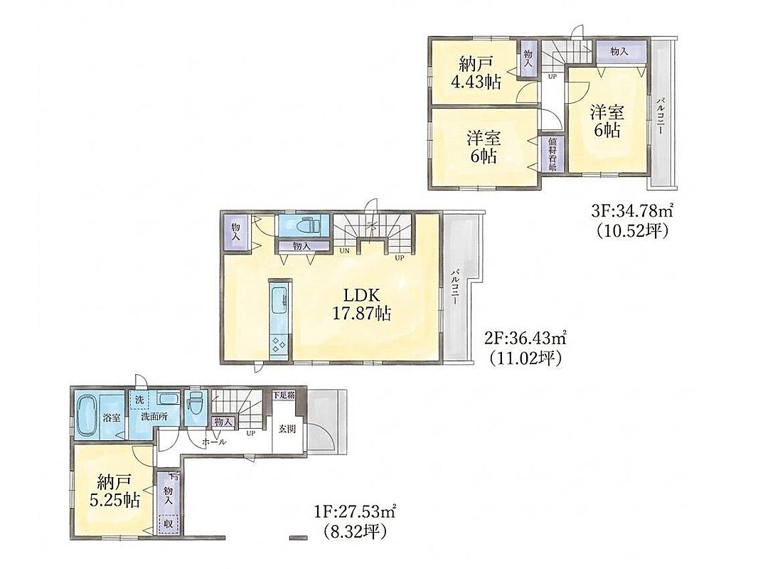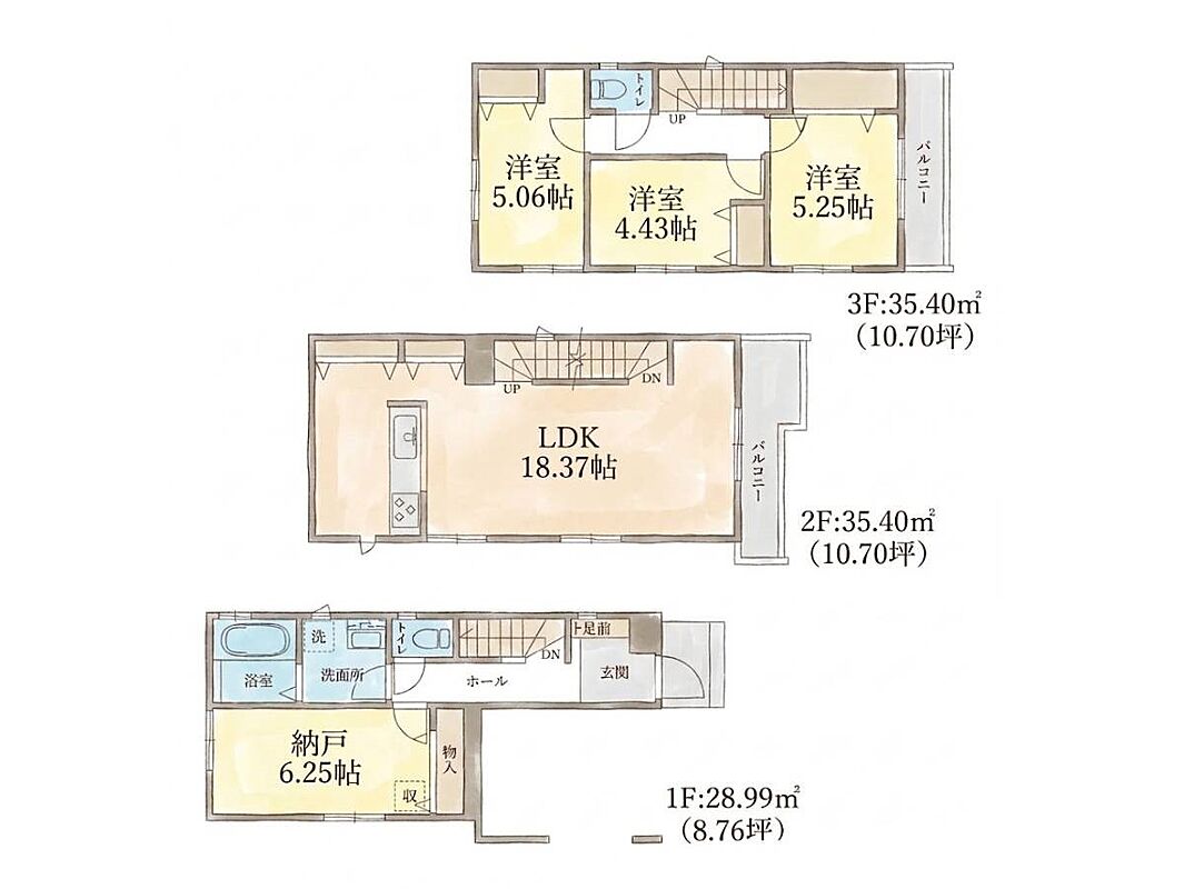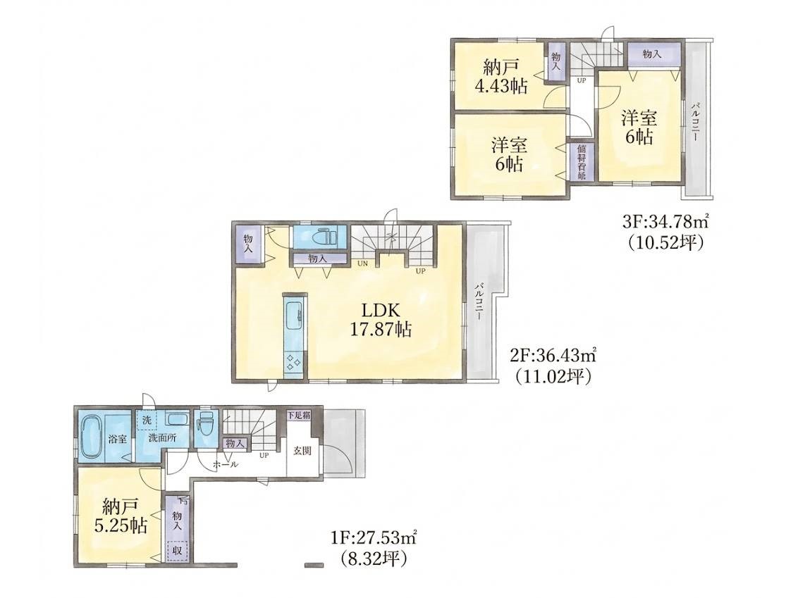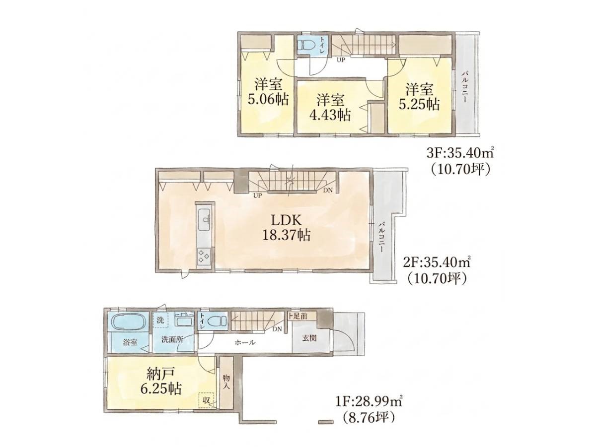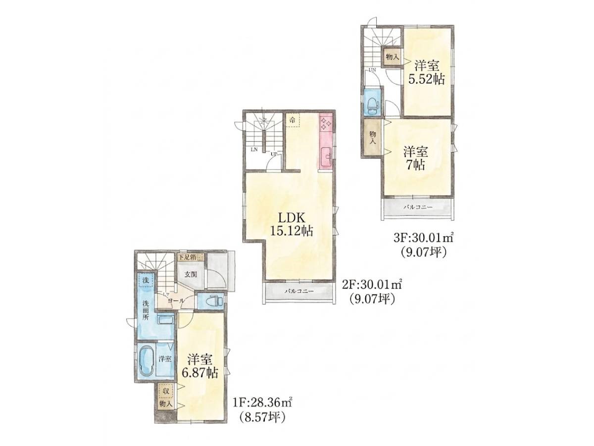 | 建物面積 | 88.38m2~99.79m2 | 土地面積 | 65.01m2~74.4m2 |