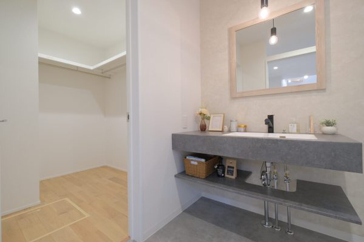 ■新築一戸建て【公開中】暮らしやすさにこだわった動線設計。キッチン~洗面室~ファミリークロークの動線は、料理と洗濯が同時にでき、洗濯後すぐに洋服を収納することができる間取りになっています。