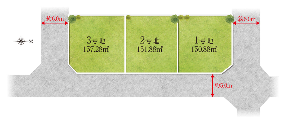 | 駐車場 | 2台 ~ 3台 | 道路の幅員 | 東側5.0m、北側6.0m、南側6.0m |