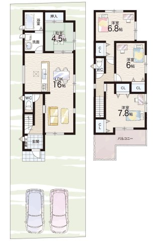 - ※完成予想図やCG合成画像は、門塀・植栽・庭・外観等、実際とは多少異なる場合があります。