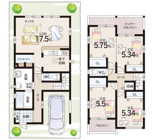 - ※完成予想図やCG合成画像は、門塀・植栽・庭・外観等、実際とは多少異なる場合があります。