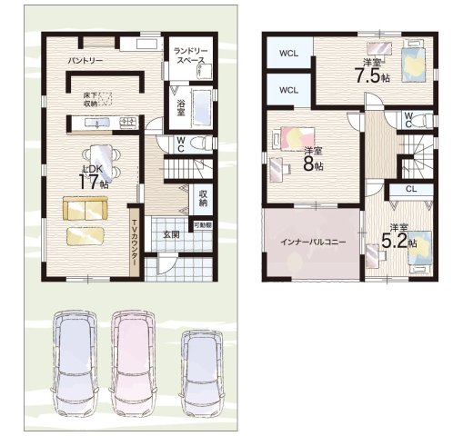 - ※完成予想図やCG合成画像は、門塀・植栽・庭・外観等、実際とは多少異なる場合があります。