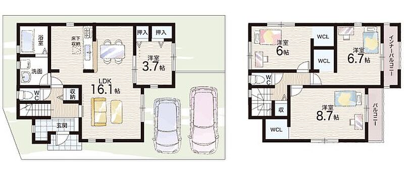 - ※完成予想図やCG合成画像は、門塀・植栽・庭・外観等、実際とは多少異なる場合があります。