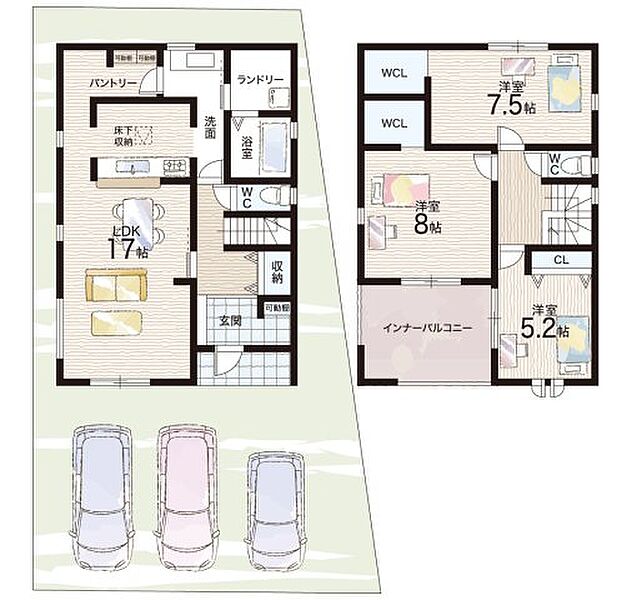- ※完成予想図やCG合成画像は、門塀・植栽・庭・外観等、実際とは多少異なる場合があります。