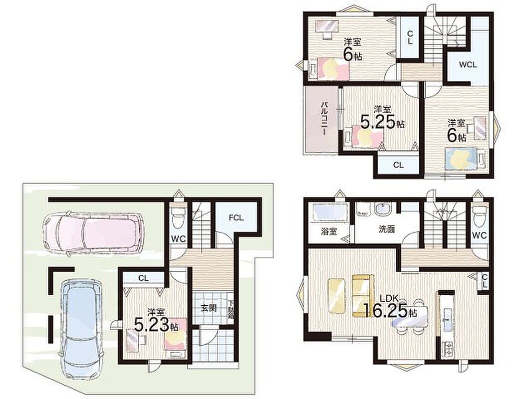 - ※完成予想図やCG合成画像は、門塀・植栽・庭・外観等、実際とは多少異なる場合があります。