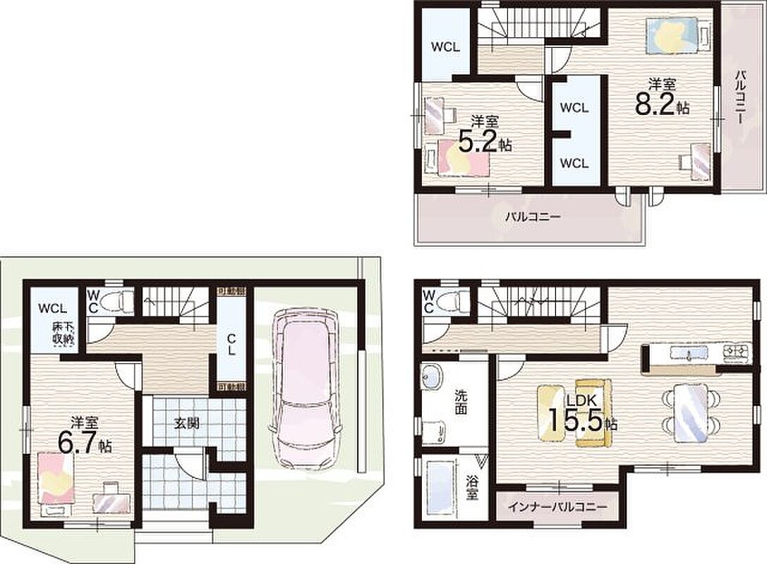 - ※完成予想図やCG合成画像は、門塀・植栽・庭・外観等、実際とは多少異なる場合があります。