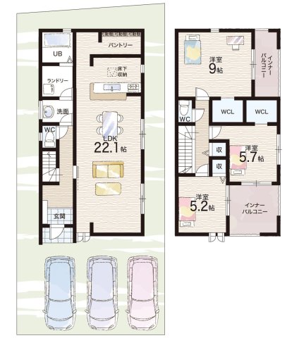 - ※完成予想図やCG合成画像は、門塀・植栽・庭・外観等、実際とは多少異なる場合があります。