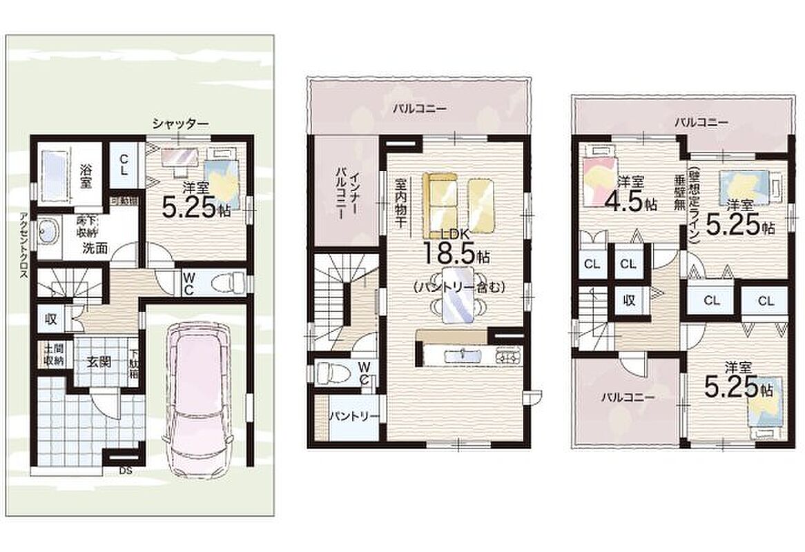 - ※完成予想図やCG合成画像は、門塀・植栽・庭・外観等、実際とは多少異なる場合があります。