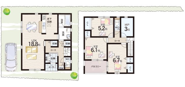 - ※完成予想図やCG合成画像は、門塀・植栽・庭・外観等、実際とは多少異なる場合があります。