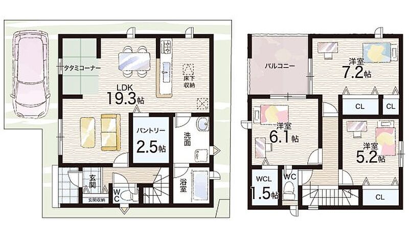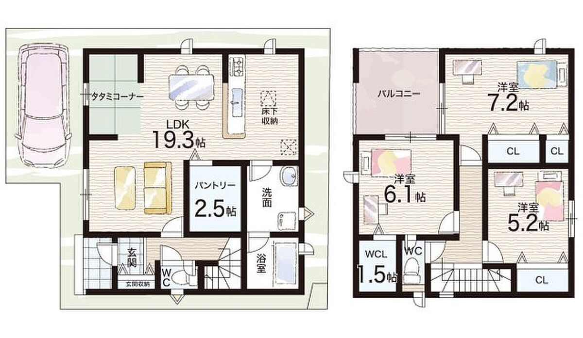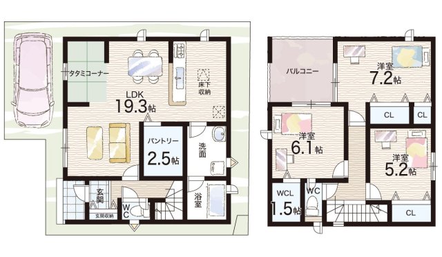 - ※完成予想図やCG合成画像は、門塀・植栽・庭・外観等、実際とは多少異なる場合があります。