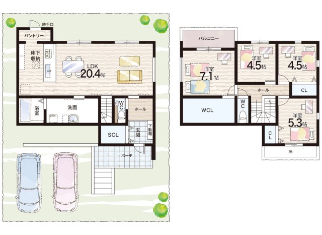 - ※完成予想図やCG合成画像は、門塀・植栽・庭・外観等、実際とは多少異なる場合があります。