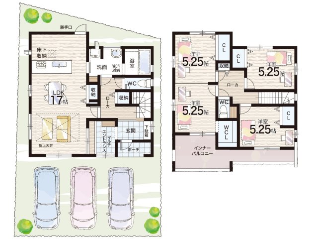 - ※完成予想図やCG合成画像は、門塀・植栽・庭・外観等、実際とは多少異なる場合があります。